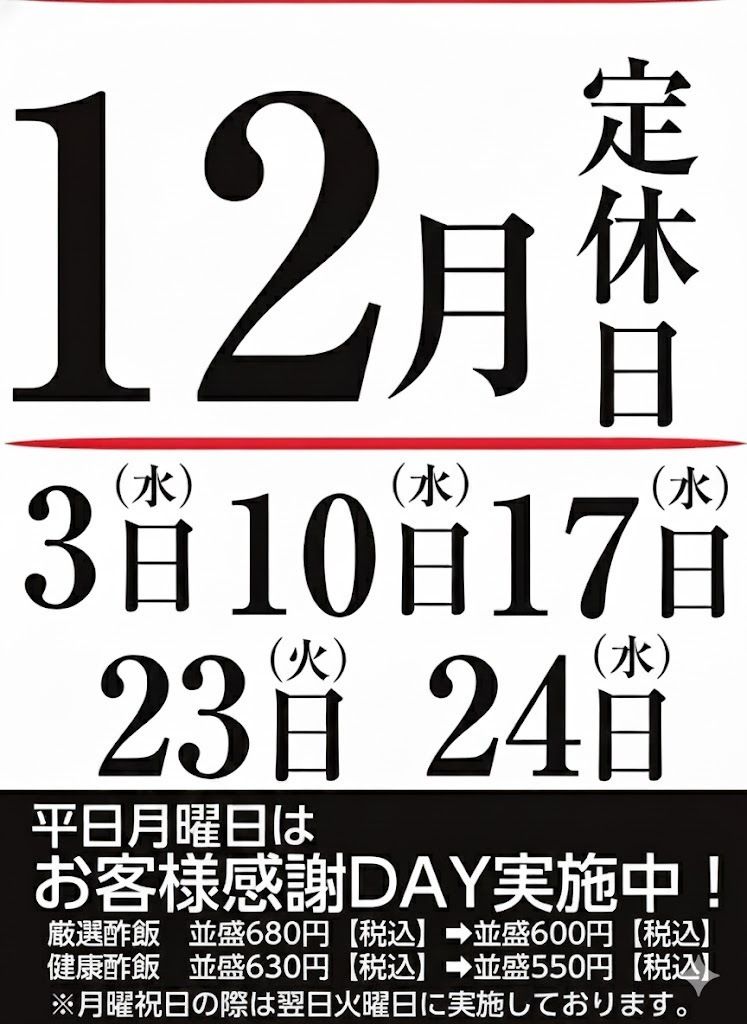 12月も家計応援!!お客様感謝デーを平日月曜日に実施いたします。