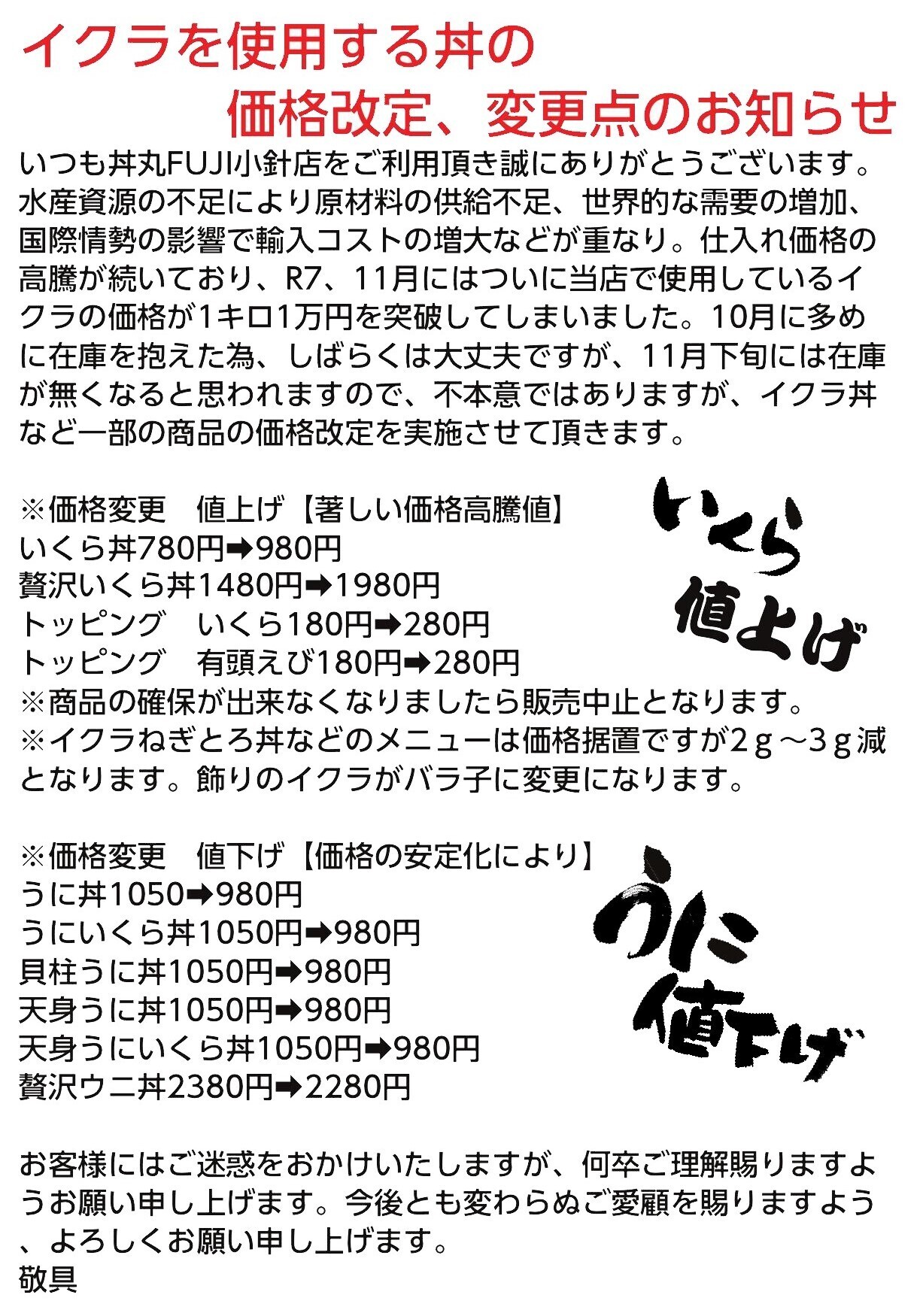 水産資源の不足により原材料の供給不足、世界的な需要の増加、国際情勢の影響で輸入コストの増大などが重なり。仕入れ価格の高騰が続いており、R7、11月にはついに当店で使用しているイクラの価格が1キロ1万円を突破してしまいました。10月に多めに在庫を抱えた為、しばらくは大丈夫ですが、11月下旬~12月上旬にはストックしている在庫が無くなると思われますので、不本意ではありますが、12月4日にイクラ丼など一部の商品の価格改定を実施させて頂きます。併せてうに丼などの商品の値下げを実施させて頂きます。
