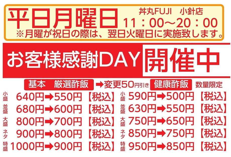 こちらの健康酢飯に変更した場合は基本価格より50円引きさせて頂きます。(並盛680円➡630円税込)健康酢飯をご希望のお客様はご用命ください。健康酢飯は数量限定となります。