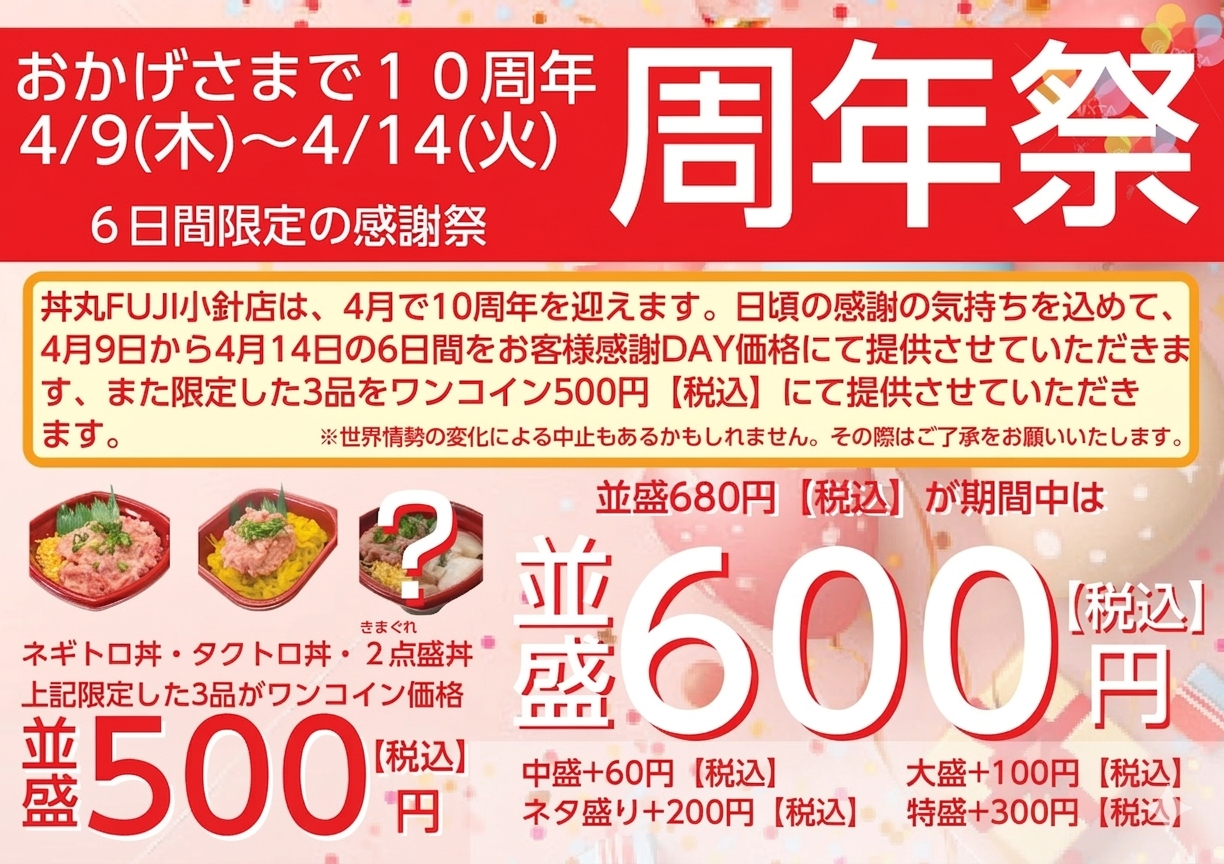 丼丸FUJI小針店は4月で10周年を迎えます。 日頃の感謝の気持ちを込めて。4月9日(木曜)~4月14日(火曜)の6日間限定で周年祭を開催予定になります。 感謝祭の期間中は、お客様感謝DAY価格にて提供させて頂き、さらにネギトロ丼、タクとろ丼、きまぐれ2点盛り丼の3品を並盛500円【税込】のワンコイン価格にて提供させて頂きます。